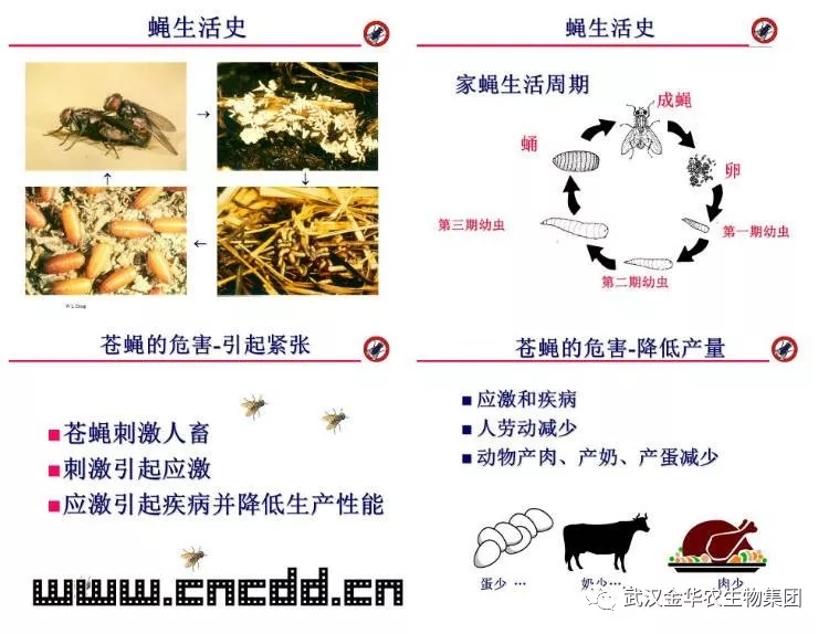 蒼蠅能否完成它的生活周期很大程度上依賴于氣候條件。當(dāng)溫度低于15℃或者高于45℃,濕度低于60%或者高于80%時(shí),能很好地抑制蒼蠅的生長(zhǎng)。而在整個(gè)蒼蠅群體中,80%處于發(fā)育期,只有20%為成蠅。因此在春季施藥“蠅蛆凈”進(jìn)行有效防制,可將蒼蠅控制于幼蟲期,成功殺滅掉,從而減少養(yǎng)殖場(chǎng)的蚊蠅數(shù)量 。