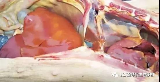 4、全身黃疸,慢性病例皮下黃染,解剖內(nèi)臟有黃染。