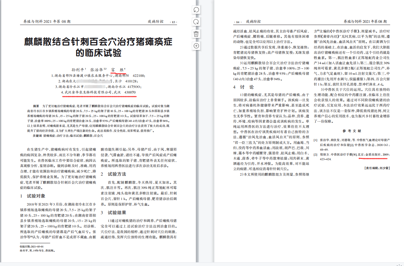 近日,武漢金華農(nóng)生物科技公司制藥研究成果取得新突破,其《麒麟散結(jié)合針刺百會穴治療豬癱瘓癥的臨床試驗》論文成功發(fā)表于行業(yè)類權(quán)威科技期刊《養(yǎng)殖與飼料》,基于散瘀生新、理傷續(xù)斷功效的“麒麟散方劑運用”獲學(xué)術(shù)認可。