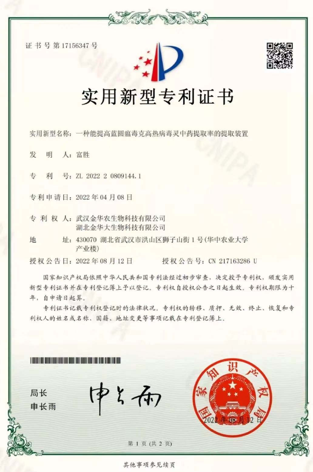 科技專利證書(藍(lán)圓瘟毒克):專利號—202220809144.1