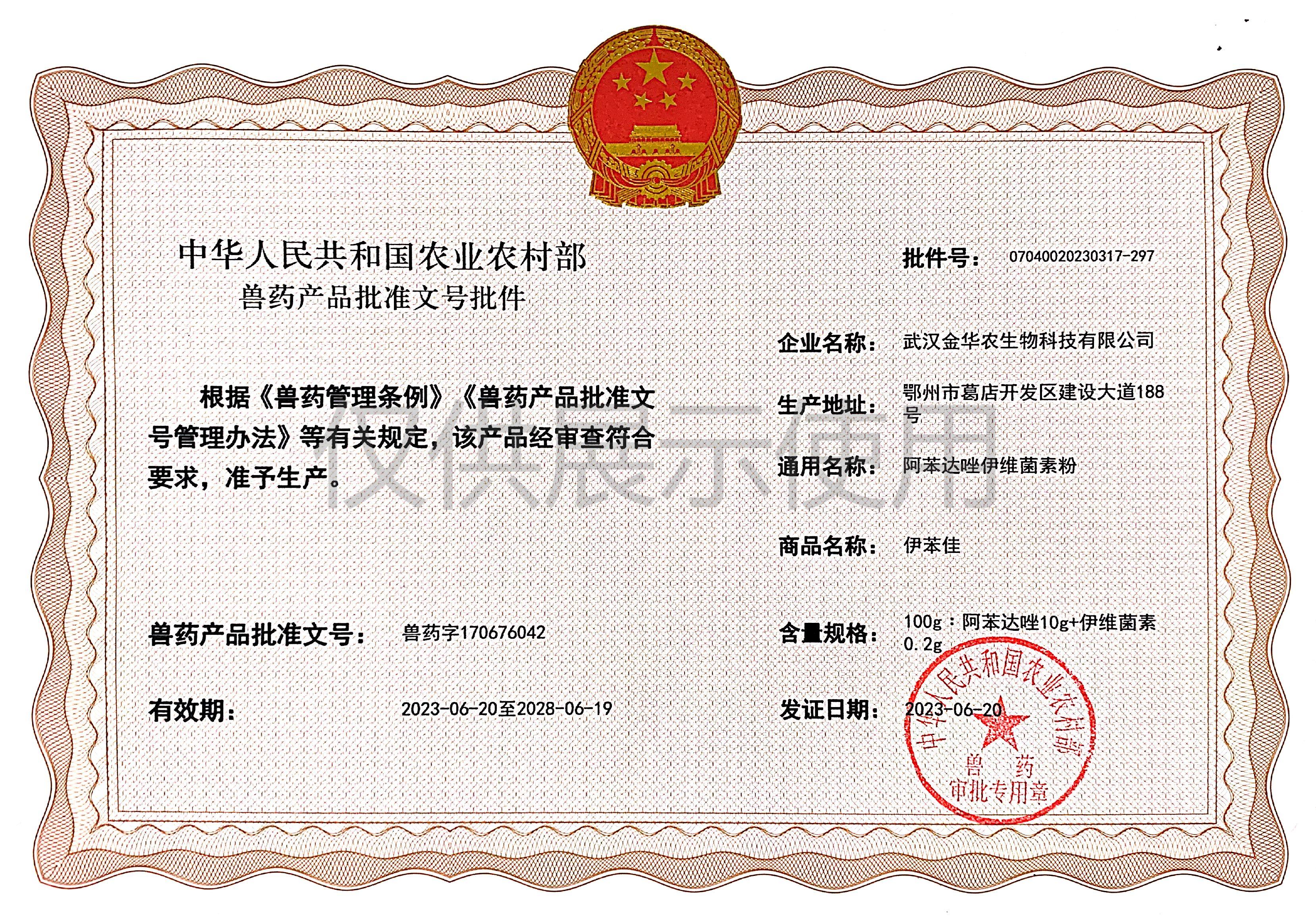 根據(jù)《獸藥管理?xiàng)l例》和《獸藥產(chǎn)品批準(zhǔn)文號(hào)管理辦法》的規(guī)定,經(jīng)農(nóng)業(yè)農(nóng)村部審查,準(zhǔn)予核發(fā)武漢金華農(nóng)生物科技有限公司(以下簡(jiǎn)稱“武漢金華農(nóng)生物”)國(guó)家新版GMP6種獸藥相關(guān)產(chǎn)品批準(zhǔn)文號(hào),這是繼今年5月我司獲得第一批新版GMP獸藥批準(zhǔn)文號(hào)后再一次獲得獸藥產(chǎn)品批準(zhǔn)文號(hào)。