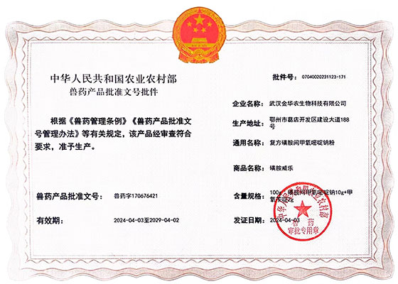 根據(jù)《獸藥管理條例》和《獸藥產(chǎn)品批準文號管理辦法》的規(guī)定,經(jīng)農(nóng)業(yè)農(nóng)村部審查,準予核發(fā)武漢金華農(nóng)生物科技有限公司2個新版GMP獸藥相關產(chǎn)品批準文號。