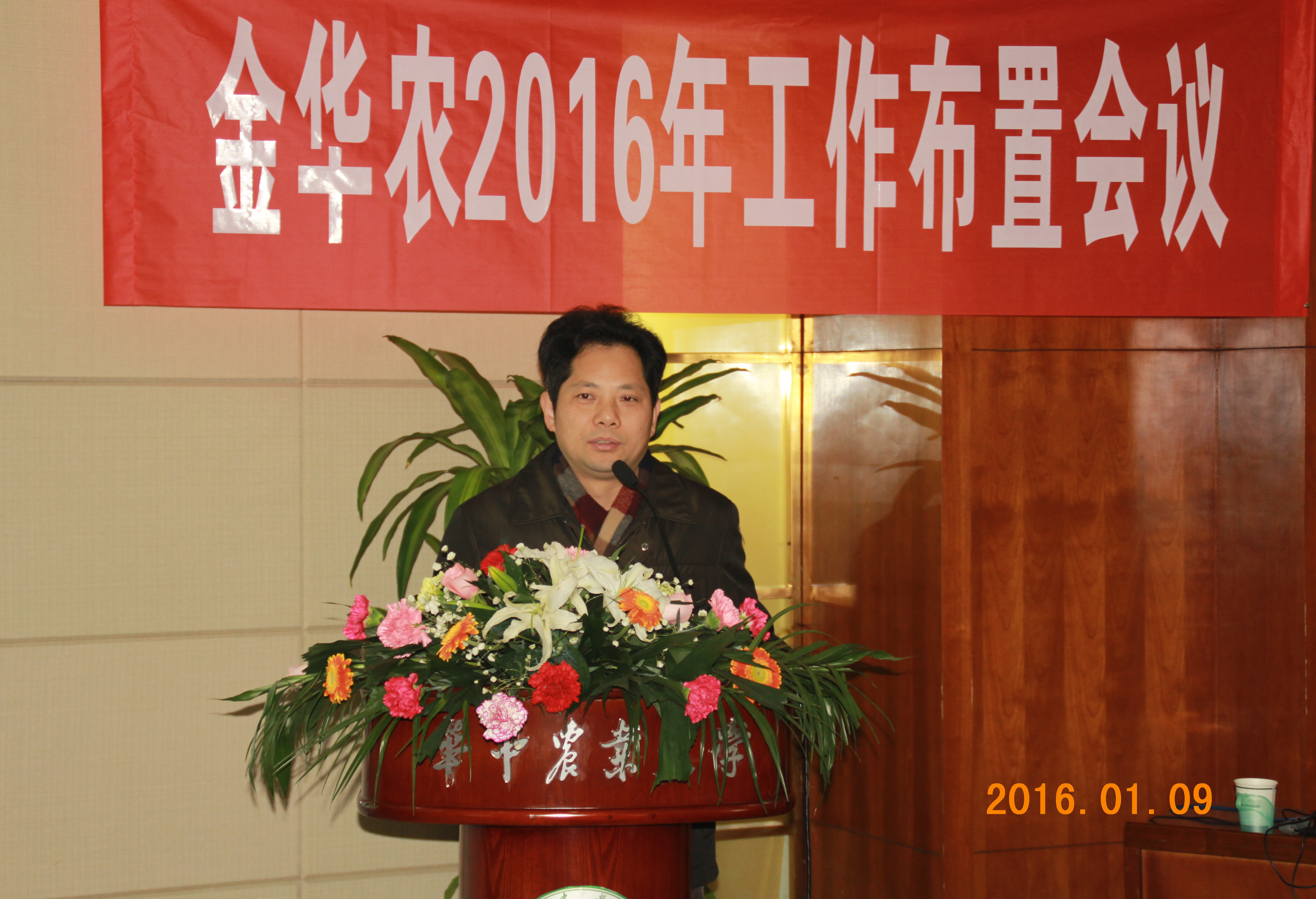 龍健飛處長致賀詞說:“肯定”、“堅守”、“拼搏”是我送給武漢金華農公司的三個關鍵詞。武漢金華農,源自華農,同時,他又服務于農業(yè)養(yǎng)殖,公司的每個元素都與“農”相關!公司的事業(yè)和成長值得肯定,只有正確認識成績,我們才能增強信心!在目前經濟增長放緩的大環(huán)境下,獸藥行業(yè)面臨洗牌重組,畜牧養(yǎng)殖業(yè)倍加艱難,對這份事業(yè),還需要企業(yè)持續(xù)的投入、需要大家的堅守!現(xiàn)在,武漢金華農,已經度過最初的草創(chuàng)期,公司發(fā)展的方向更明確,那就是富總說的:“做好藥,良心藥!打造中國動保杰出品牌”,只要我們拼搏,就一定能實現(xiàn)這個愿景!2016年,讓我們一起為金華農加油!
