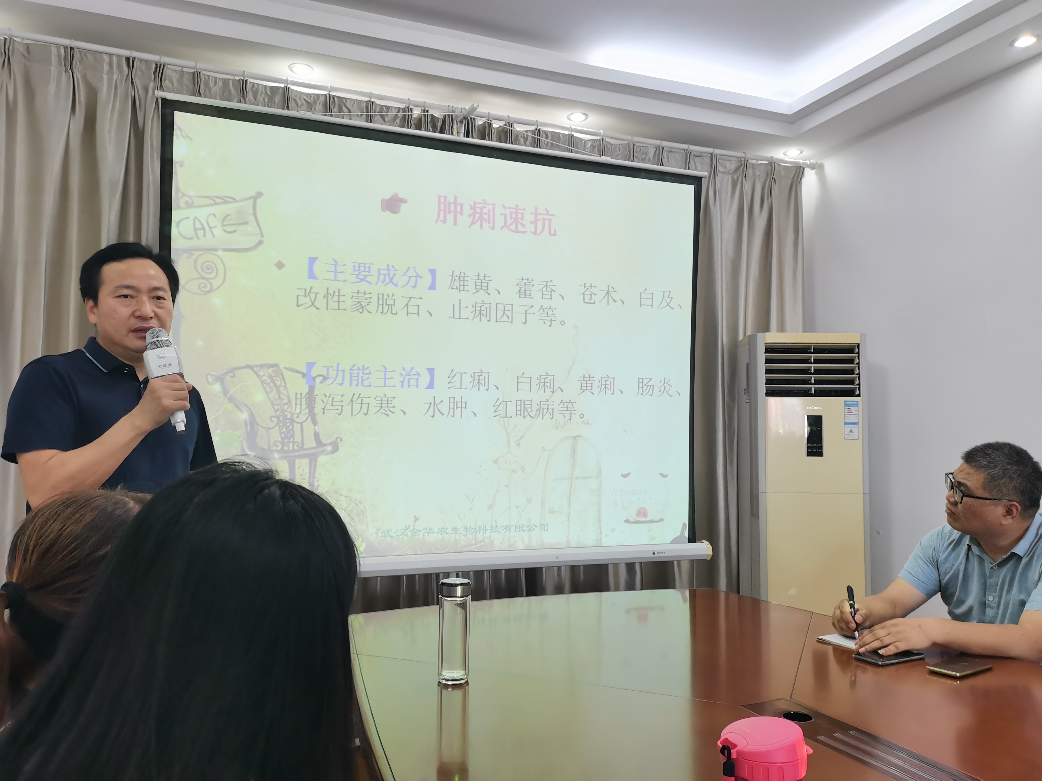 ? ? 隨后,富勝董事長對全體員工進行了培訓,展開現場教學,重點普及了藥品知識,針對每一個產品的屬性與治療功效細致地進行了介紹,業(yè)務培訓干貨滿滿。