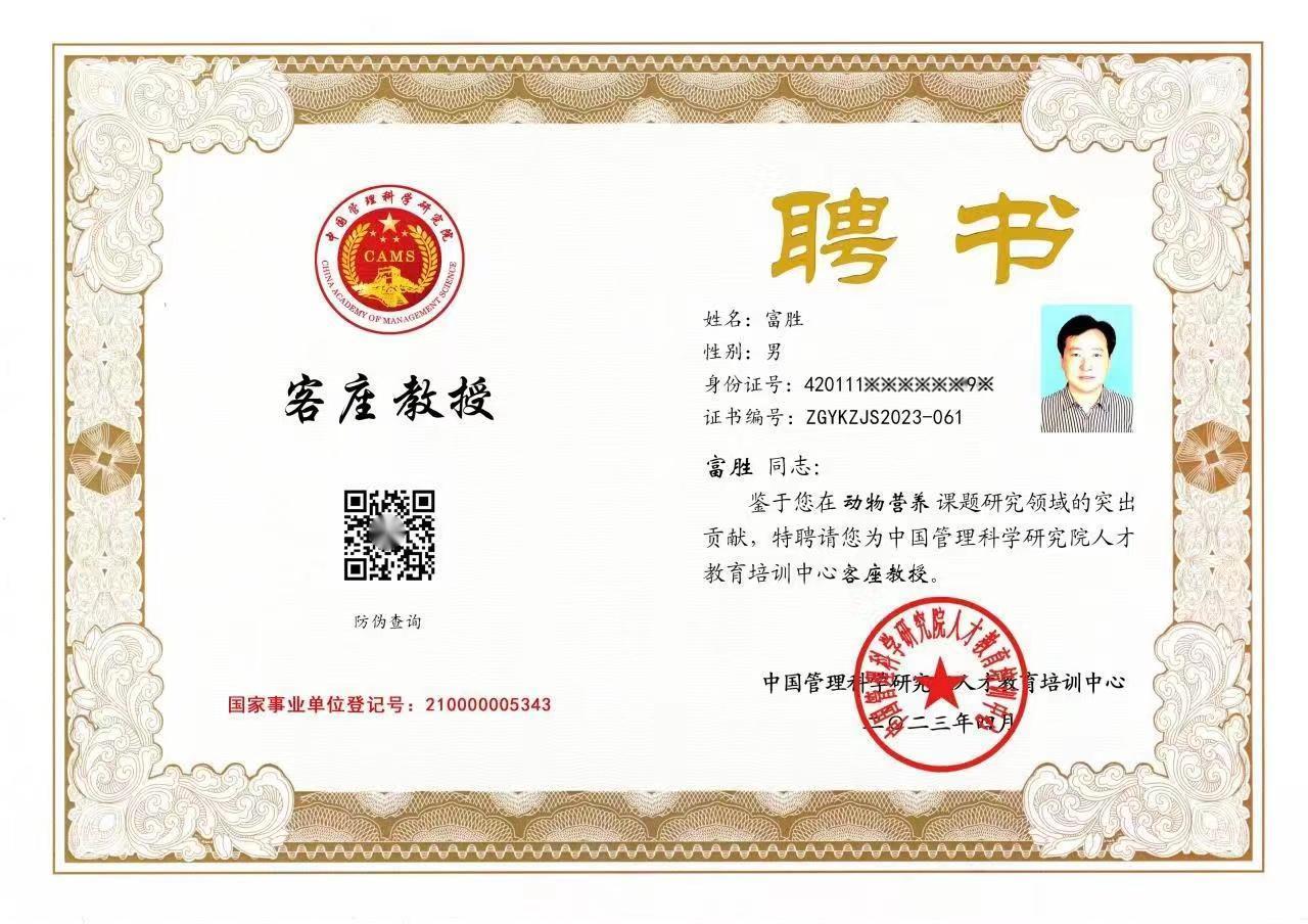 中國科學研究院“動物營養(yǎng)”榮譽證書