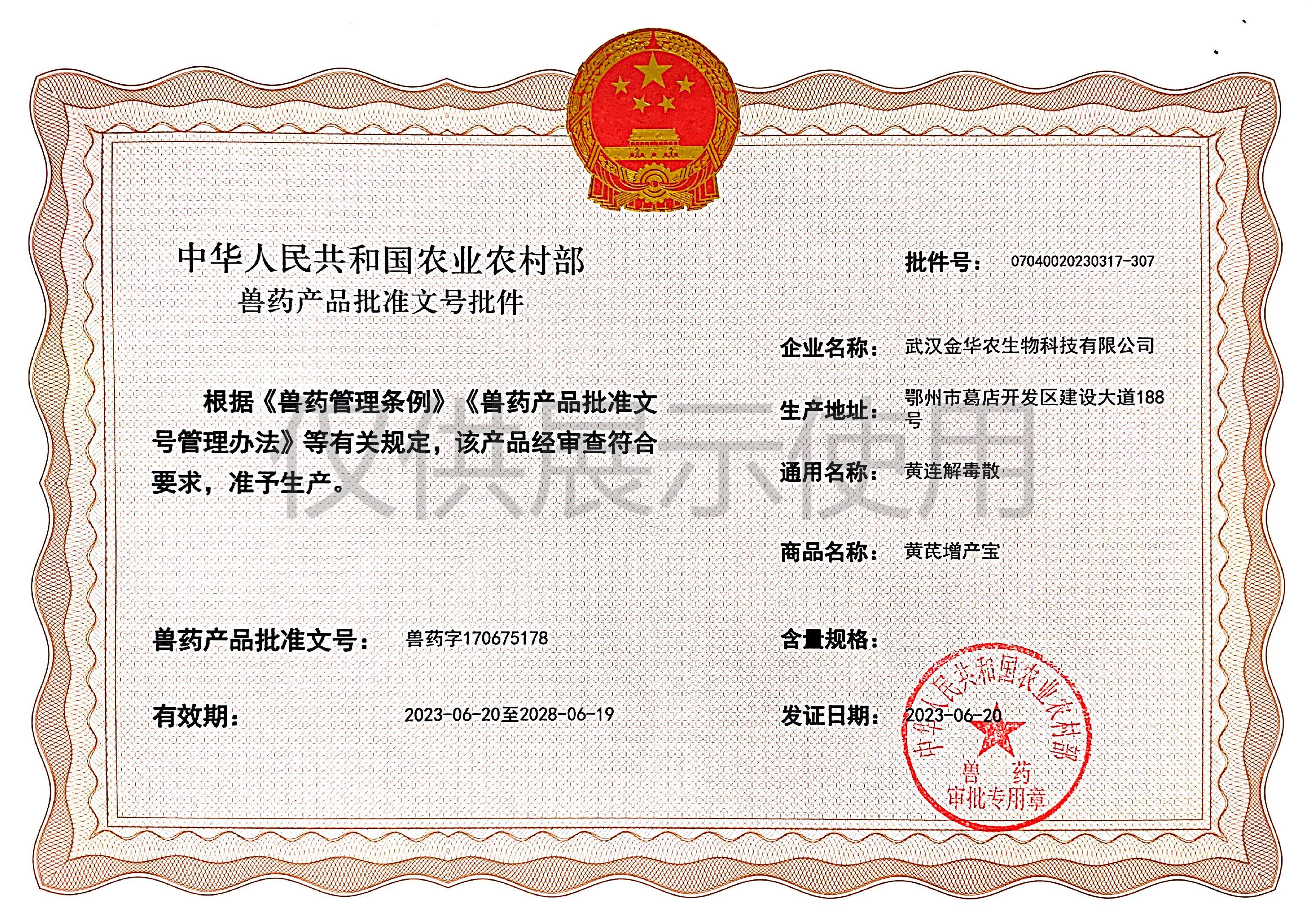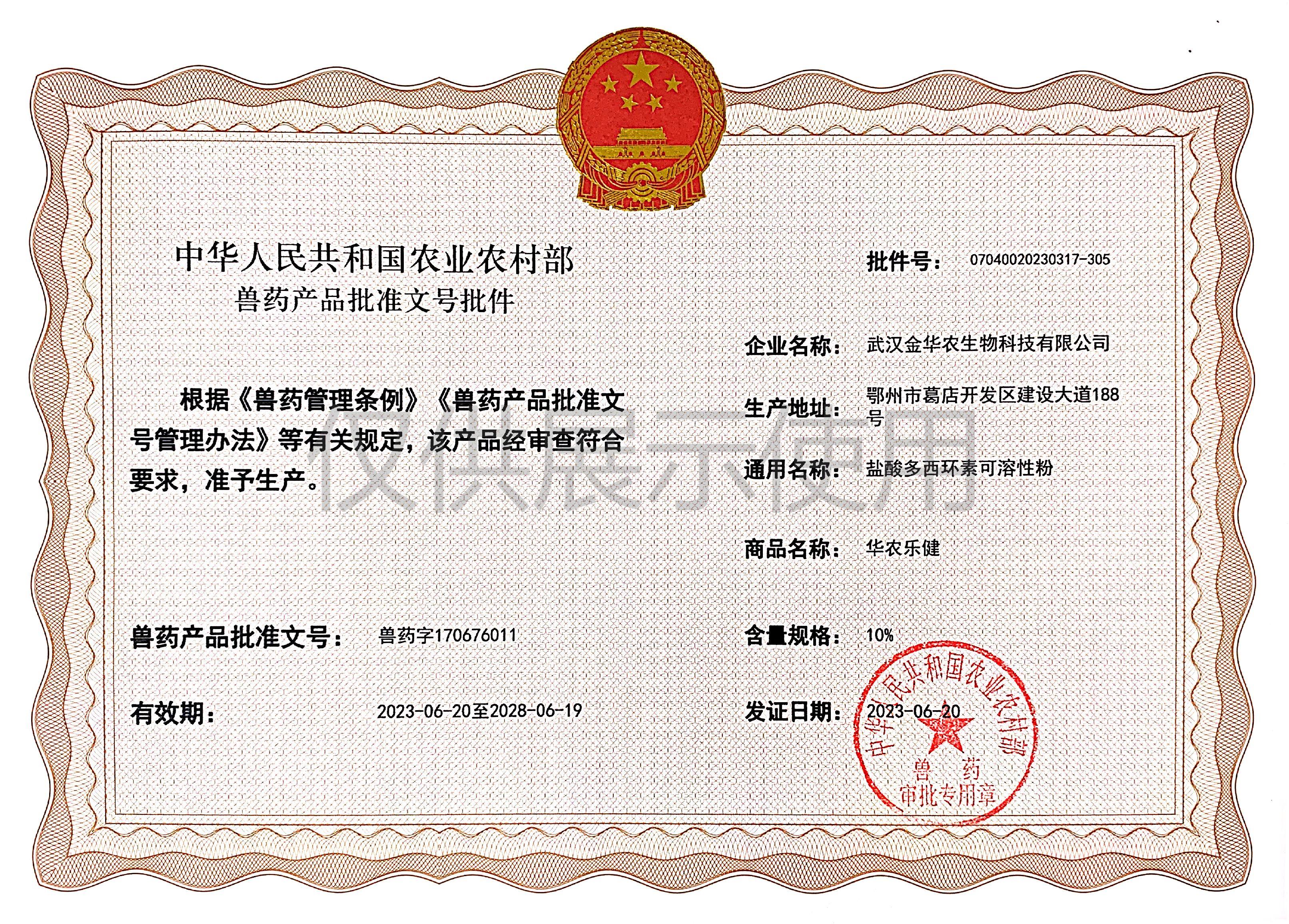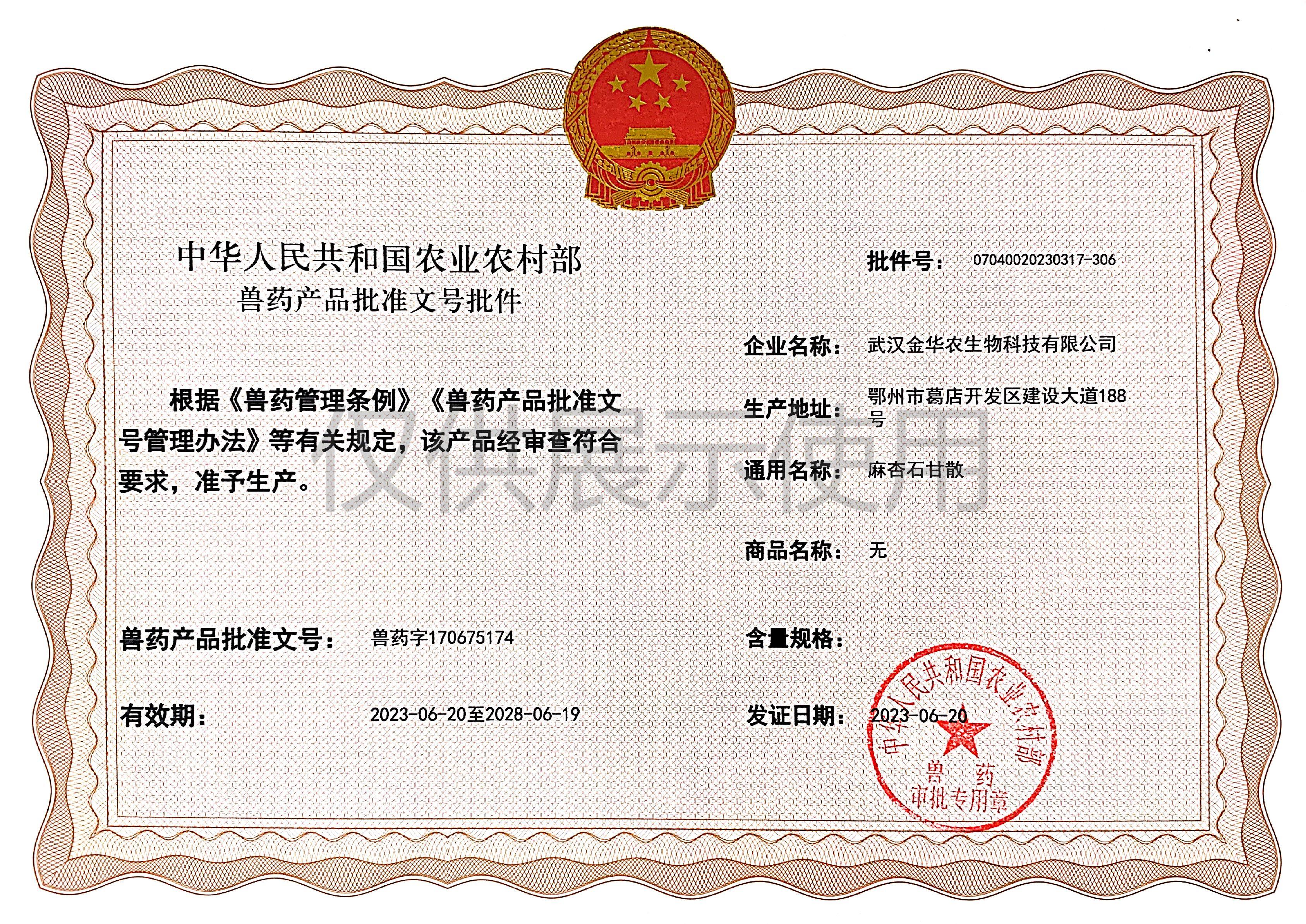根據(jù)《獸藥管理?xiàng)l例》和《獸藥產(chǎn)品批準(zhǔn)文號(hào)管理辦法》的規(guī)定,經(jīng)農(nóng)業(yè)農(nóng)村部審查,準(zhǔn)予核發(fā)武漢金華農(nóng)生物科技有限公司(以下簡(jiǎn)稱“武漢金華農(nóng)生物”)國(guó)家新版GMP6種獸藥相關(guān)產(chǎn)品批準(zhǔn)文號(hào),這是繼今年5月我司獲得第一批新版GMP獸藥批準(zhǔn)文號(hào)后再一次獲得獸藥產(chǎn)品批準(zhǔn)文號(hào)。