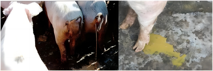 ②豬出現(xiàn)鐵銹斑、淚斑、糞便結(jié)塊等高熱導(dǎo)致的一系列病癥,用“附弓敗毒清+華農(nóng)樂(lè)健”。