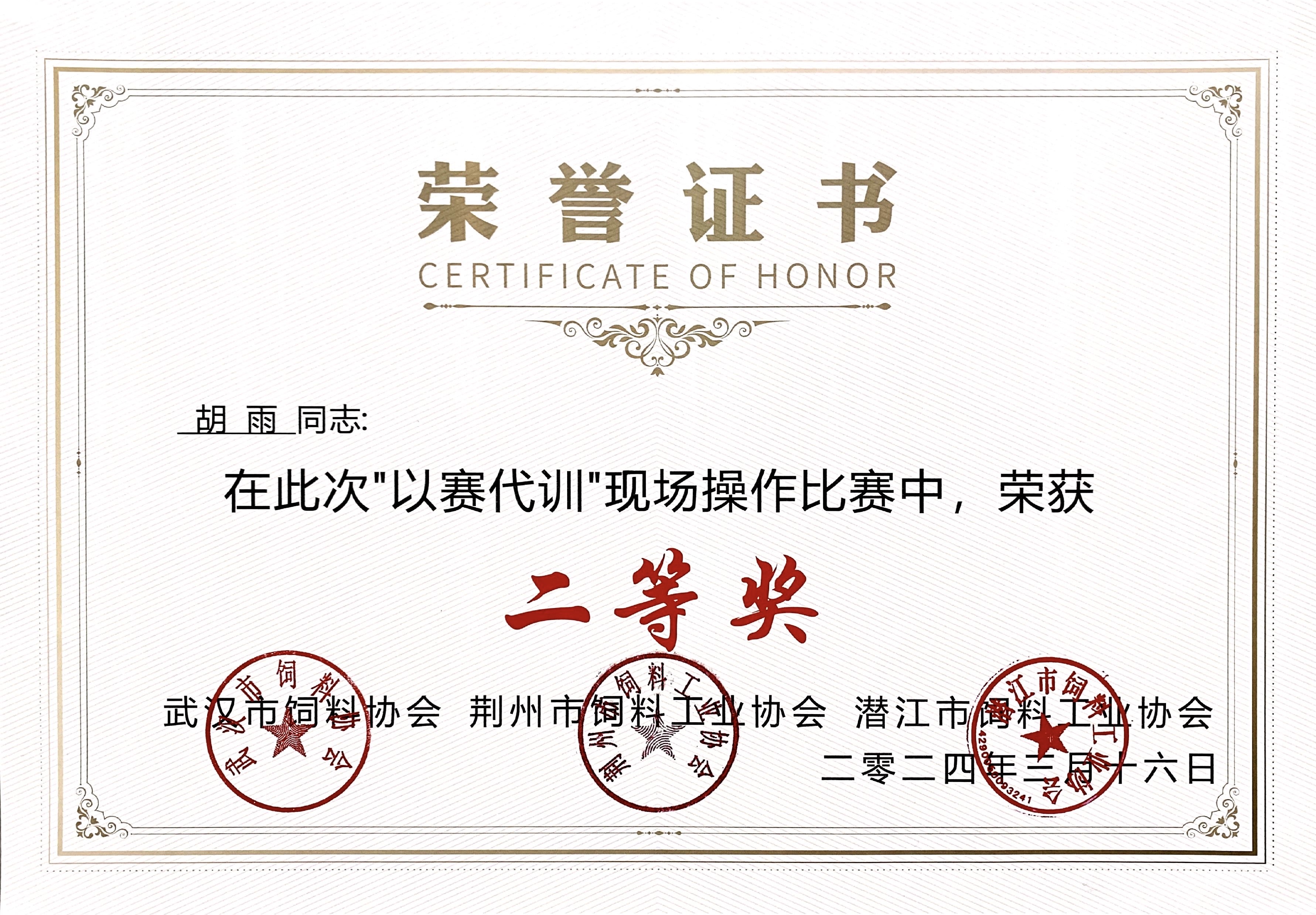 ? ? ??根據(jù)湖北省農(nóng)業(yè)農(nóng)村廳的相關精神,武漢市農(nóng)業(yè)農(nóng)村局積極組織實施,由武漢市飼料協(xié)會主辦的“以賽代訓”專業(yè)技能考試大PK活動圓滿落幕。在這場激烈的競爭中,我司質(zhì)量部胡雨憑借扎實的專業(yè)知識和出色的應變能力,脫穎而出,榮獲比賽“二等獎”,為公司贏得了榮譽,同時也充分展現(xiàn)了個人風采,可喜可賀!大賽由武漢市飼料協(xié)會主辦,荊州市飼料工業(yè)協(xié)會、潛江市飼料工業(yè)協(xié)會承辦。共有40多名選手在比賽中競技爭鋒。