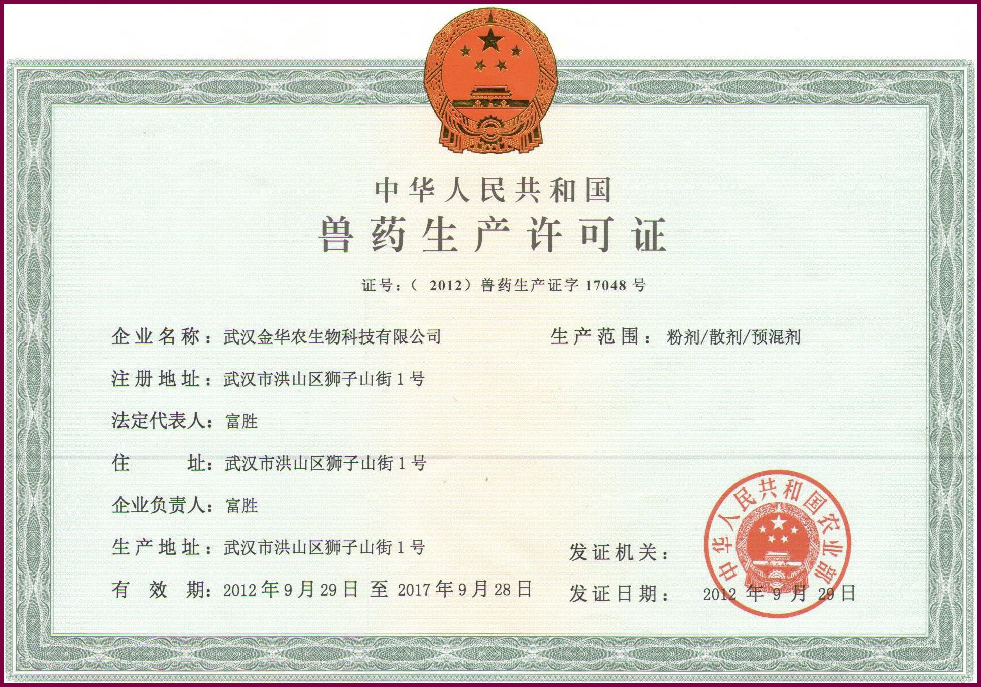 ??2012年9月28日、29日,武漢金華農(nóng)獲國家農(nóng)業(yè)部頒發(fā)雙證---【(2012)獸藥GMP證字317號】和獸藥生產(chǎn)許可證【(2012)獸藥生產(chǎn)證字17048號】同期到達(dá),雙喜生輝!