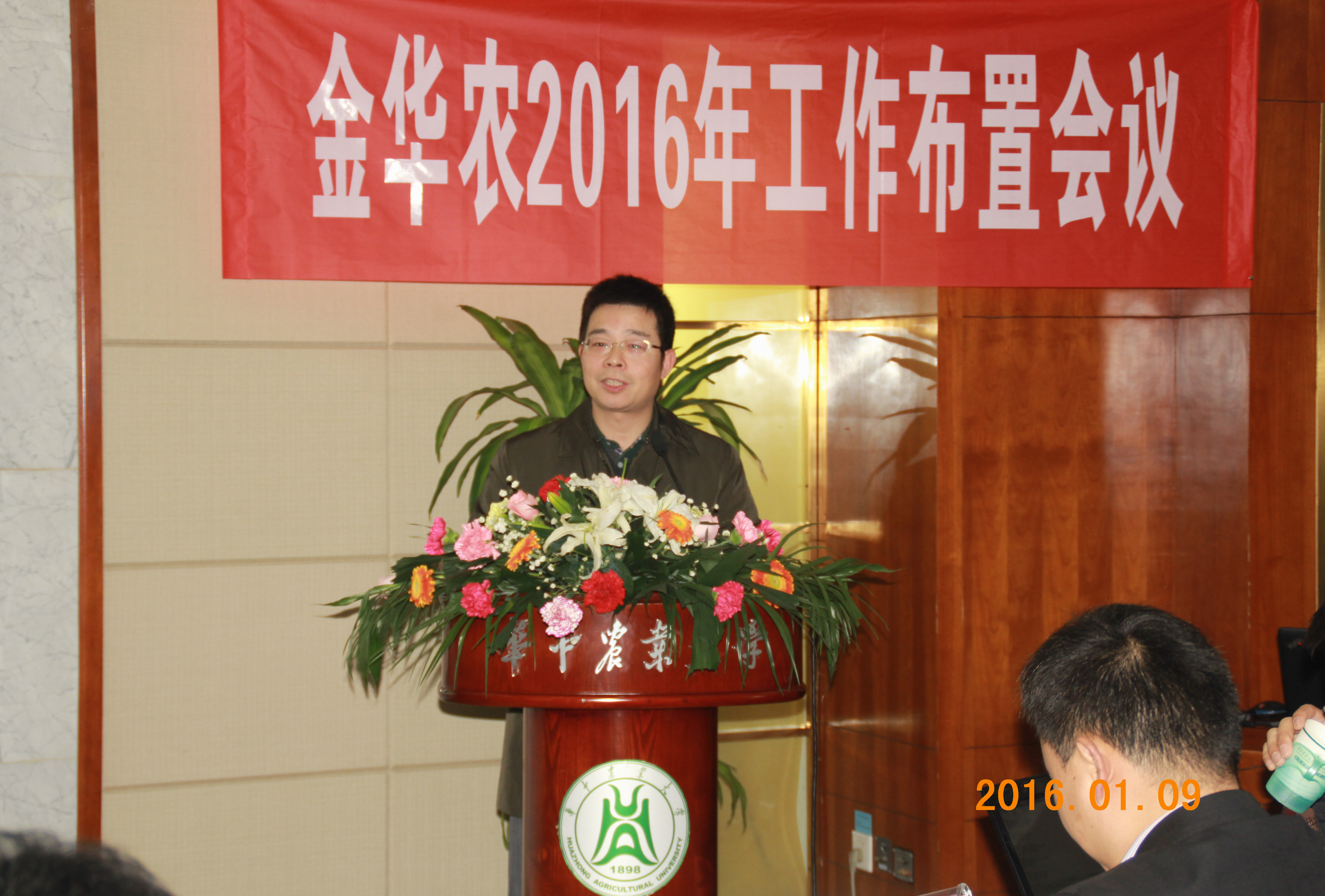 龍健飛處長致賀詞說:“肯定”、“堅守”、“拼搏”是我送給武漢金華農公司的三個關鍵詞。武漢金華農,源自華農,同時,他又服務于農業(yè)養(yǎng)殖,公司的每個元素都與“農”相關!公司的事業(yè)和成長值得肯定,只有正確認識成績,我們才能增強信心!在目前經濟增長放緩的大環(huán)境下,獸藥行業(yè)面臨洗牌重組,畜牧養(yǎng)殖業(yè)倍加艱難,對這份事業(yè),還需要企業(yè)持續(xù)的投入、需要大家的堅守!現(xiàn)在,武漢金華農,已經度過最初的草創(chuàng)期,公司發(fā)展的方向更明確,那就是富總說的:“做好藥,良心藥!打造中國動保杰出品牌”,只要我們拼搏,就一定能實現(xiàn)這個愿景!2016年,讓我們一起為金華農加油!
