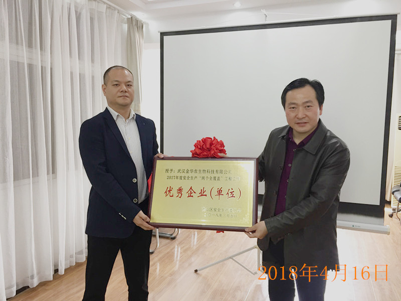 2018年4月16日,武漢金華農(nóng)生物應(yīng)邀出席并參加武漢市“企業(yè)家論壇”活動暨武漢市“優(yōu)秀企業(yè)”評選與表彰大會,我公司光榮獲得“優(yōu)秀企業(yè)”稱號!本次會議是由武漢市政府質(zhì)量安全監(jiān)督局、統(tǒng)籌規(guī)劃局、農(nóng)業(yè)局、畜牧局共同組織、策劃與承辦。